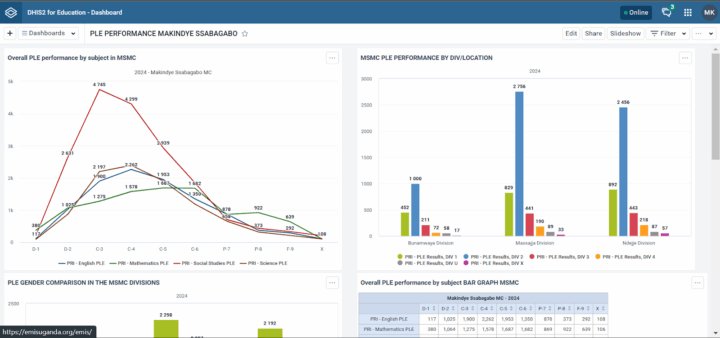 The introduction of DHIS2 at the municipal level, supported by the HISP Uganda team, has fundamentally transformed this workflow. What once took weeks can now be accomplished in a day, thanks to real-time data analysis, which enables faster, evidence-based decisions. Tasks like identifying the municipality’s best-performing school, analyzing subject-specific pass rates, and comparing performance by sex are now seamless. A striking example of this efficiency is this year’s UNEB analysis, where district dashboard visualizations revealed Social Studies (SST) as the top-performing subject, while Mathematics lagged behind – all clearly displayed through instant, system-generated line graphs; revealing insights that were previously buried in static PDFs.